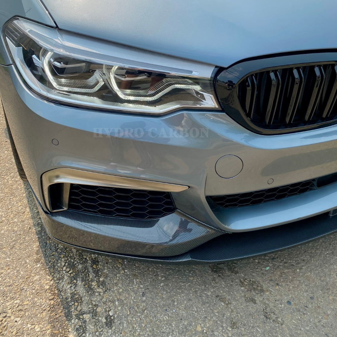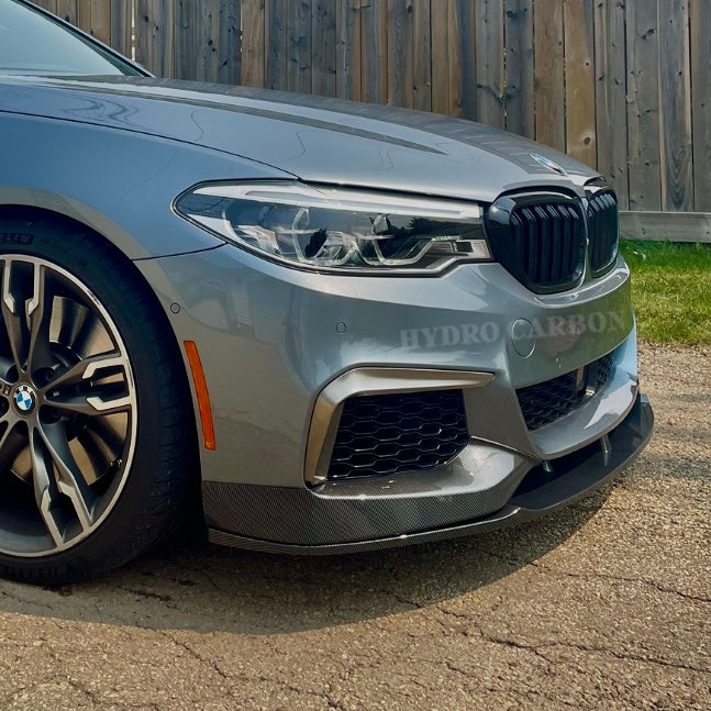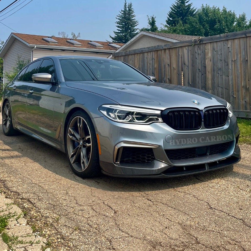 FITS: G30 M550I/ 540I/ 530I/ 530E (M SPORT) BODY TYPE: SEDAN, WAGON, SALOON YEAR: 2017-2020 BRAND: HYDRO CARBON INSTALLATION: DIRECT FIT USING BOLTS/ 3M TAPEBehold the epitome of automotive elegance and performance, the BMW 5 Series G30 Carbon Fiber Dipped M Performance Style Front Lip is a masterpiece that transcends the boundaries of ordinary driving. This avant garde accessory is a symphony of sophistication and aerodynamic prowess, meticulously crafted to redefine the very essence of luxury.