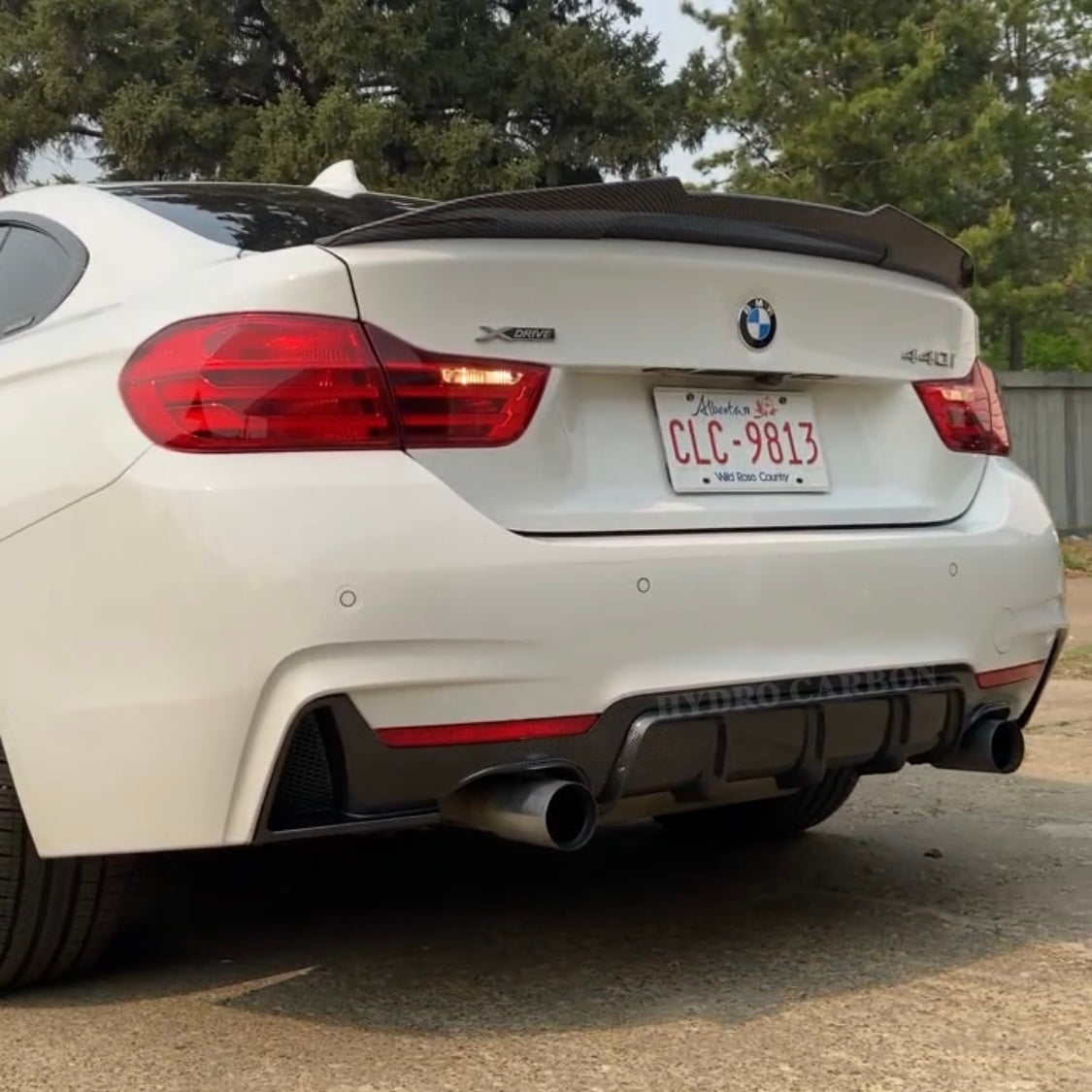 FITS: 440i/ 435i/ 430I/ 428i (M-SPORT) MAKE: F36/ F33/ F32 4 SERIES YEAR: 2014-2020 BRAND: HYDRO CARBON INSTALLATION: FULL OEM REPLACEMENTThis BMW 4 Series Hydro Carbon diffuser is an exquisite automotive accessory designed to enhance the aesthetic appeal and aerodynamic performance of your F36, F33 or F32. Crafted with precision and attention to detail, this rear diffuser seamlessly integrates with the BMW's design, adding a touch of sophistication and sportiness to its rear profile. Functionally, the rear diffuser serves a crucial role in optimizing aerodynamics by managing airflow underneath the vehicle. This not only contributes to improved stability at higher speeds but also enhances overall driving performance.